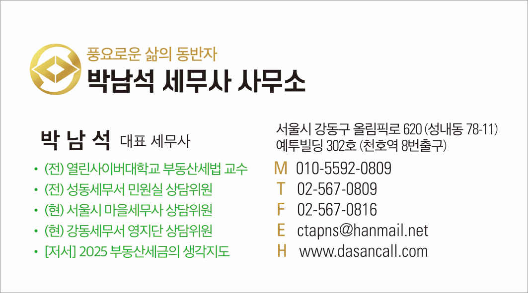일반주택과 양도소득세(재개발재건축 제외) 강사 : 박남석세무사 일자 : 11월 6일(목), 11월 13일(목), 11월 20일(목) 총 3일 9시간 시간 : 19시~22시 장소: 박남석세무회계사무소 주소: 서울시 강동구 올림픽로 620 예투빌딩 302호 150,000원
